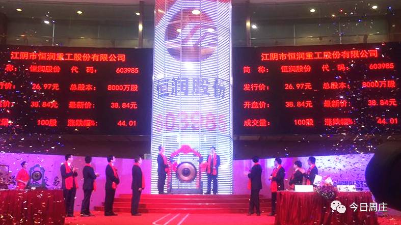 2017年5月5日江陰市恒潤(rùn)重工股份有限公司在上證交易所隆重上市,股票簡(jiǎn)稱“恒潤(rùn)股份”,股票代碼603985。本次公開(kāi)發(fā)行股票數(shù)量2000萬(wàn)股,發(fā)行價(jià)格26.97元,發(fā)行市盈率22.99倍,發(fā)行后總股本8000萬(wàn)元。上市首日,“恒潤(rùn)股份”就受到市場(chǎng)的高度關(guān)注和投資者的認(rèn)可追捧,一開(kāi)盤(pán),股價(jià)就升至38.84元,漲幅44%。