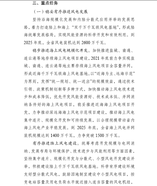 規(guī)劃提出:堅(jiān)持沿海規(guī)模化發(fā)展和內(nèi)陸分散式應(yīng)用并舉的發(fā)展思路,著力打造陸上和海上“雙千萬(wàn)千瓦級(jí)風(fēng)電基地”,形成陸海統(tǒng)籌發(fā)展格局,實(shí)現(xiàn)風(fēng)能資源的科學(xué)開(kāi)發(fā)和有效利用。到2025年底,全省風(fēng)電裝機(jī)達(dá)到2600萬(wàn)千瓦。